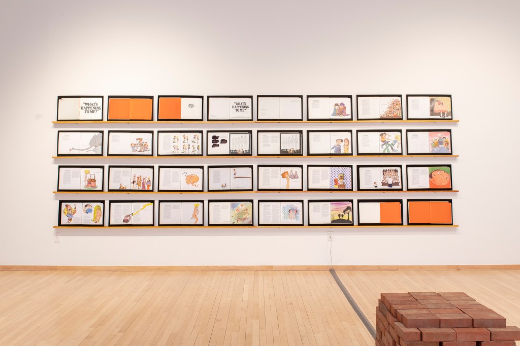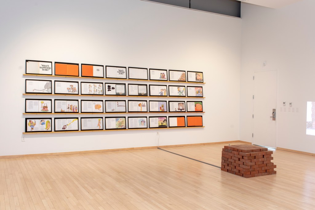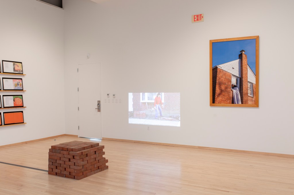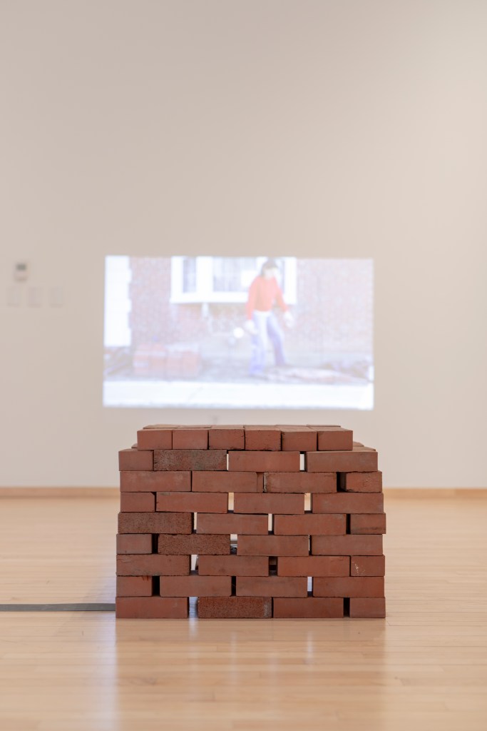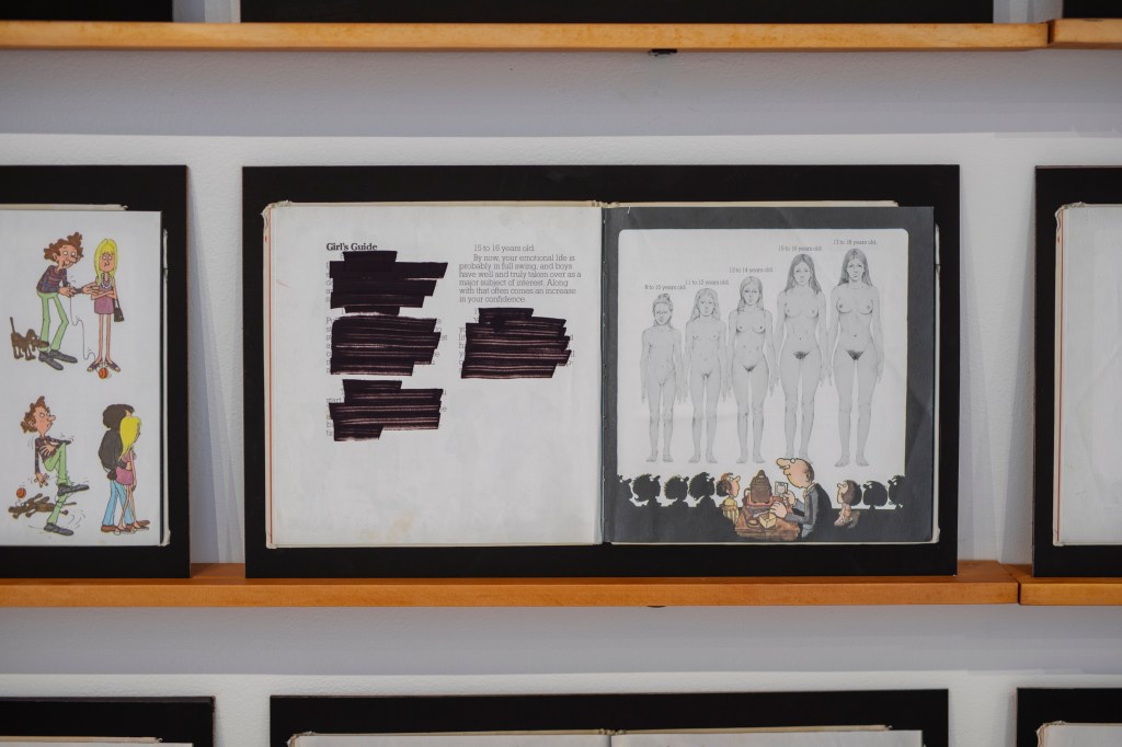 The images portray both a physical and ideological space, exploring the tensions within its structures and the subtle ways objects disrupt or redefine those boundaries. The deconstruction of What’s Happening to Me? By Pete Mayle exposes how these expectations are introduced in childhood, embedding conventional ideas of gender and sexuality long before they are understood. A video work shows the repetitive act of moving bricks from one pile to another, a gesture that speaks to reconstructing the foundations of identity and space.